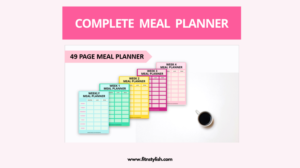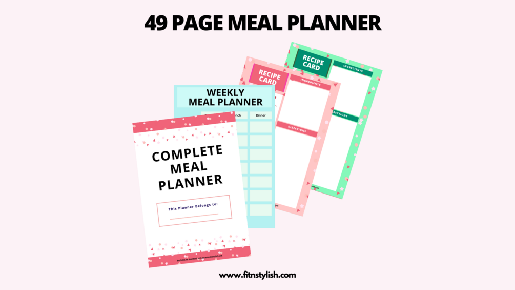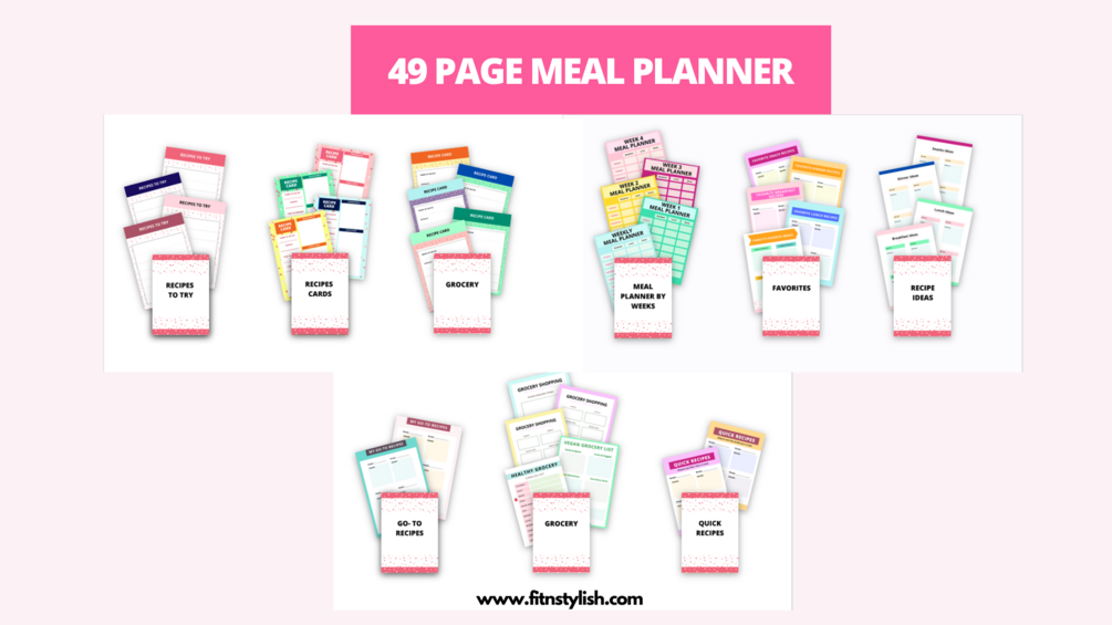 Printable Meal Planner with 49 pages to plan your meal every week + recipe cards, favorite recipe, go-to recipe templates and more.